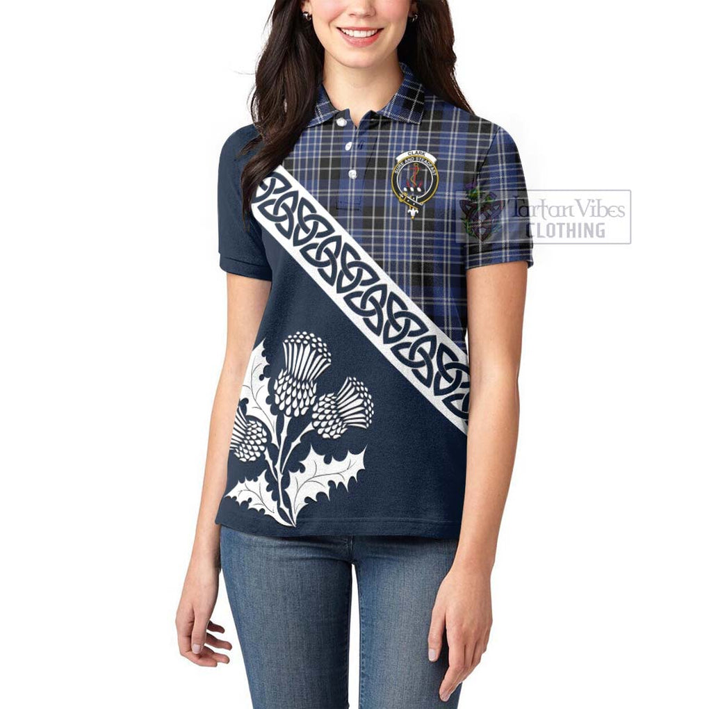 Clark (Clarke) Tartan Women's Polo Shirt Featuring Thistle and Scotland Map