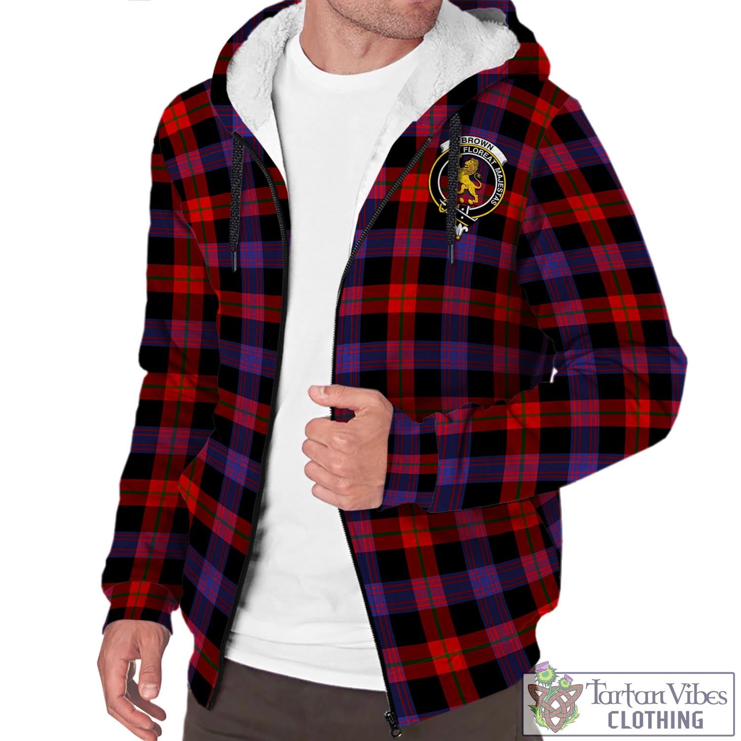 Brown (Broun) Tartan Sherpa Hoodie with Family Crest