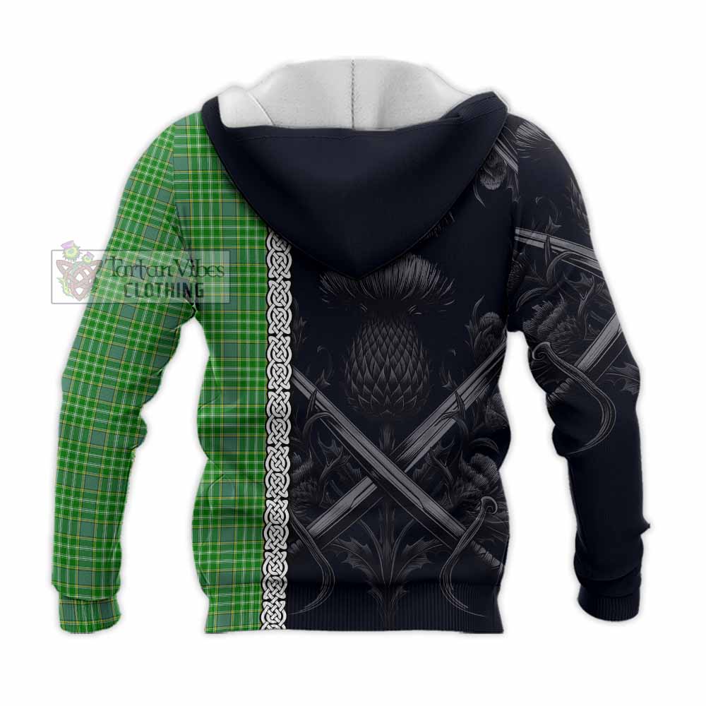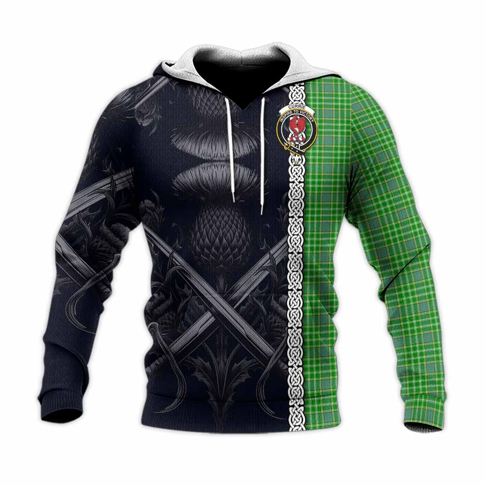 Currie Tartan Knitted Hoodie with Family Crest Cross Sword Thistle Celtic Vibes