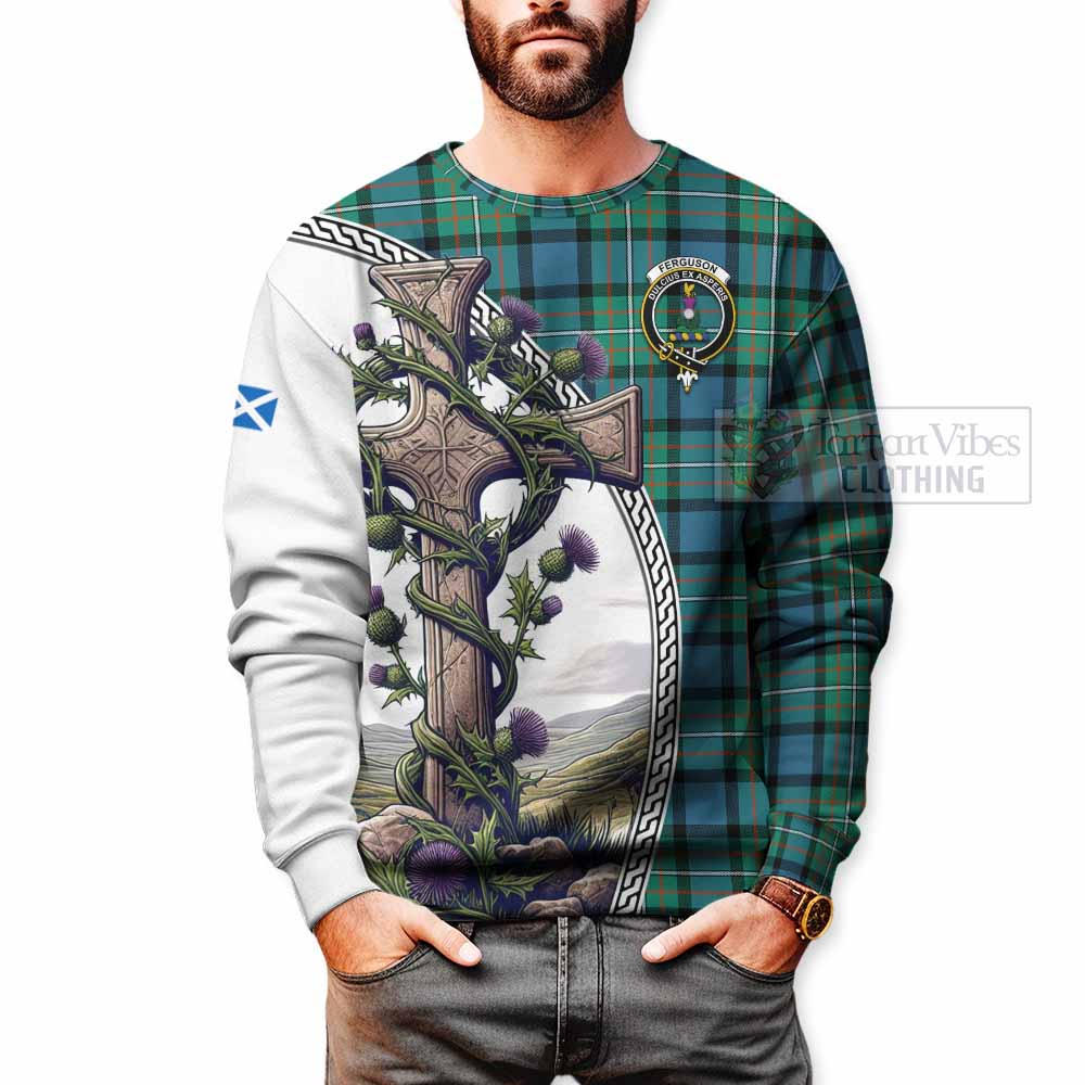 Ferguson (Fergusson) Tartan Sweatshirt with Family Crest and St. Andrew's Cross Accented by Thistle Vines