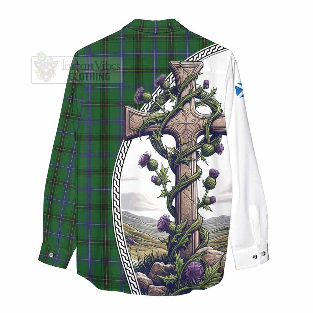 Henderson Tartan Women's Casual Shirt with Family Crest and St. Andrew's Cross Accented by Thistle Vines