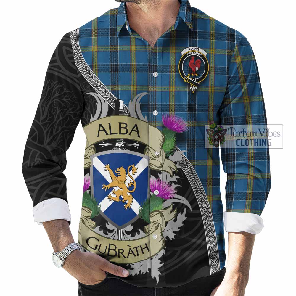 Laing Tartan Family Crest Long Sleeve Button Shirt Lion Rampant Royal Thistle Shield Celtic Inspired